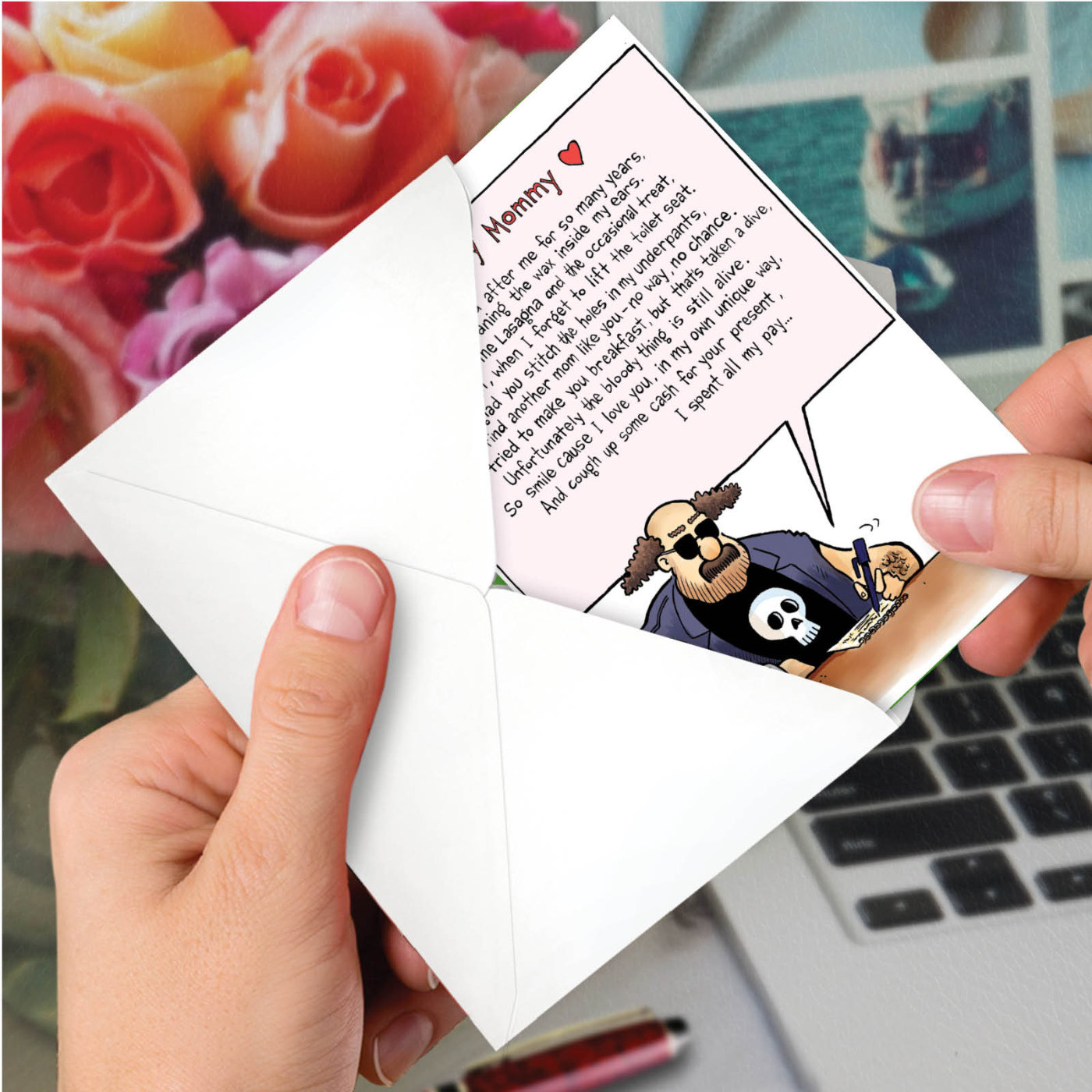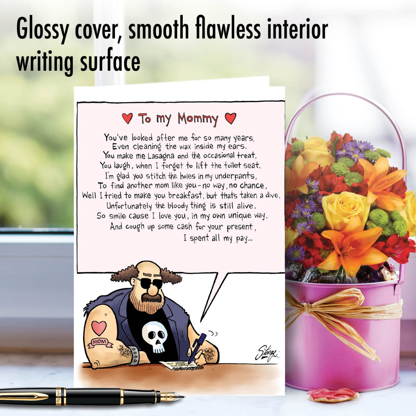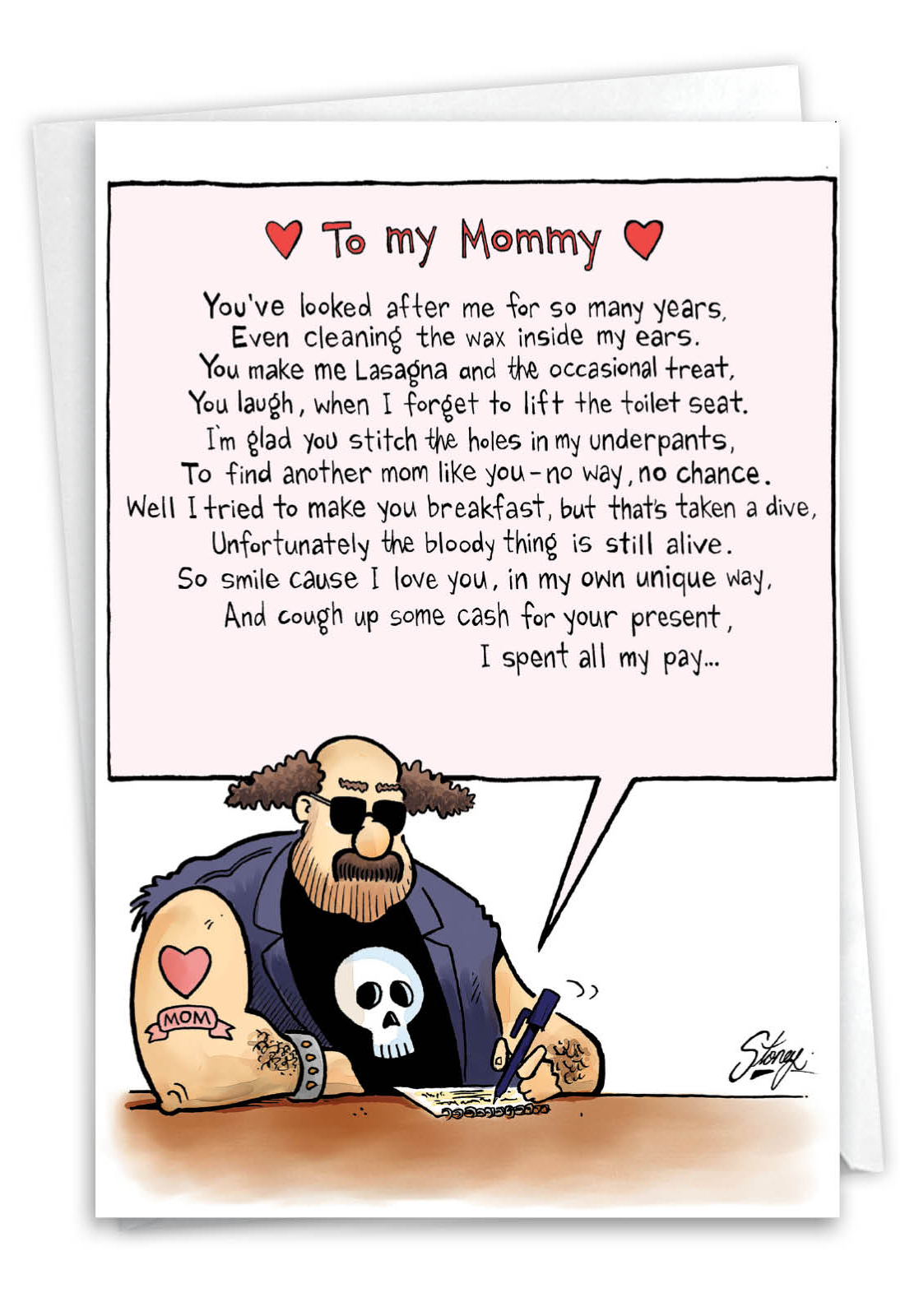 You've Looked After Me For So Many Years. Even Cleaning The Wax Inside My Ears. You Make Me Lasagna And The Occasional Treat. You Laugh, When I Forget To Lift The Toilet Seat. I'm Glad You Stitch The Holes In My Underpants. To Find Another Mom Like You - No Way, No Chance. Well I Tried To Make You Breakfast, But That's Taken A Dive, Unfortunately The Bloody Thing Is Still Alive. So Smile Cause I Love You, In My Own Unique Way. And Cough Up Some Cash For Your Present, I Spent All My Pay...