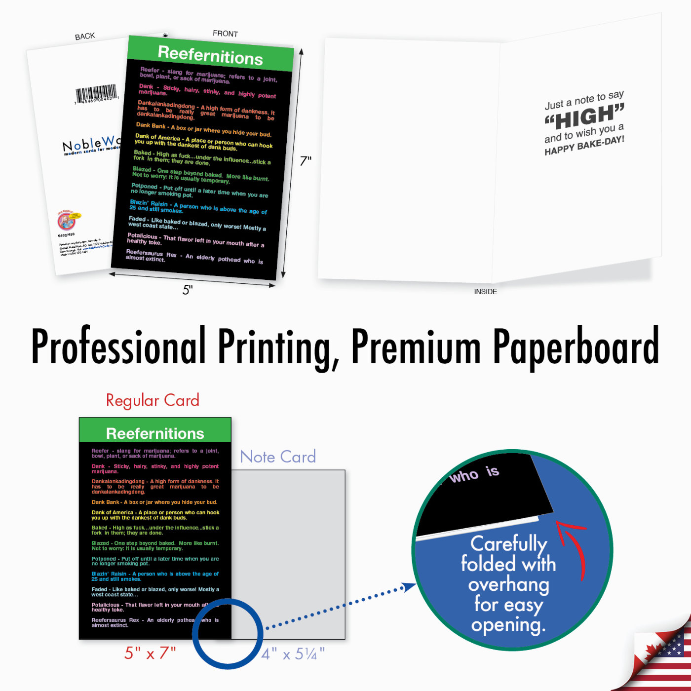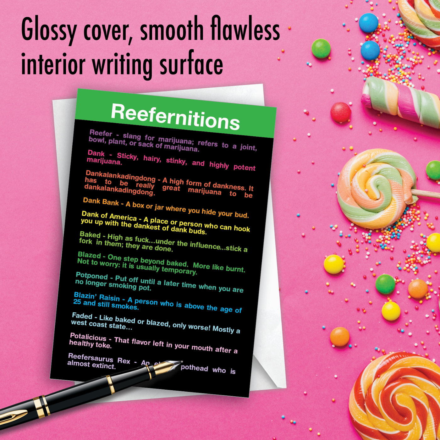 Reefernitions: Reefer - slang for marijuana; refers to a joint, bowl, plant, or sack of marijuana. Dank - sticky, hairy, stinky, and highly potent marijuana. Dankalankadingdong - A high form of dankness. It has to be really great marijuana to be dankalankadingdong. Dank Bank - A box or jar where you hide your bud. Dank of America - A place or person who can hook you up with the dankest of dank buds. Baked - High as F...under the influence...stick a fork in them; they are done. Blazed - One step beyond baked. More like burnt. Not to worry: it is usually temporary. Potponed - Put off until a later time when you are no longer smoking pot. Blazin' Raisin - A person who is above the age of 25 and still smokes. Faded - Like baked or blazed, only worse! Mostly a west coast state...Potalicious - That flavor left in your mouth after a healthy toke. Reefersaurus Rex - An elderly pothead who is almost extinct.