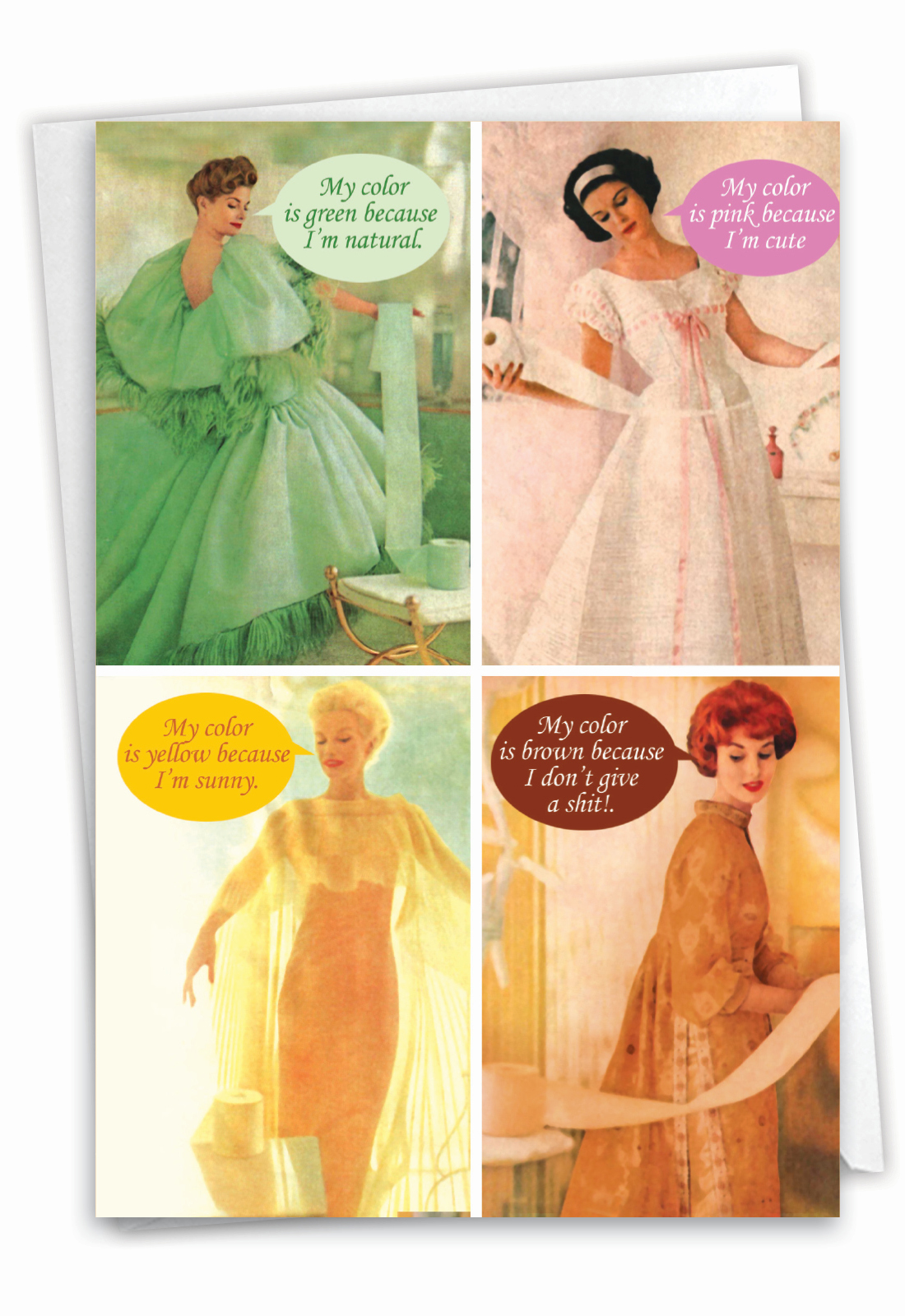 Green: My Color Is Green Because I'm Natural. Pink: My Color Is Pink Because I'm Cute. Orange: My Color Is Orange Because I'm Chirpy. Brown: My Color Is Brown Because I Don't Give A Shit.