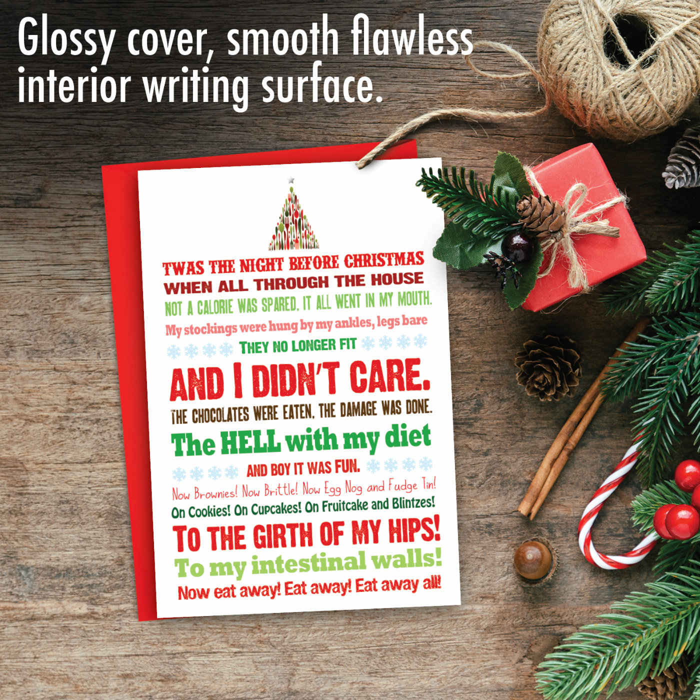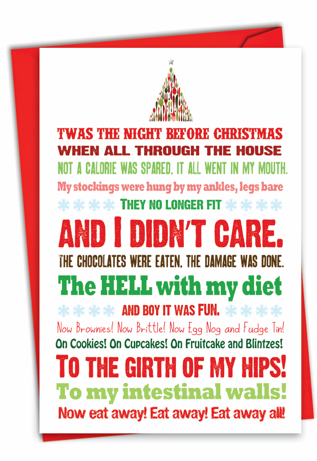 Tő Was The Night Before Christmas When All Through The House Not A Calorie Was Spared, It All Went In My Mouth. My Stockings Were Hung By My Ankles, Legs Bare. They No Longer Fit And I Didnőt Care. The Chocolates Were Eaten, The Damage Was Done. The Hell With My Diet, And Boy Was It Fun. Now Brownies! Now Brittle! Now Eggnog And Fudge! On Cookies! On Cupcakes! On Fruitcakes And Blintzes! To The Girth Of My Hips! To My Intestinal Walls! Now Eat Away! Eat Away! Eat Away!