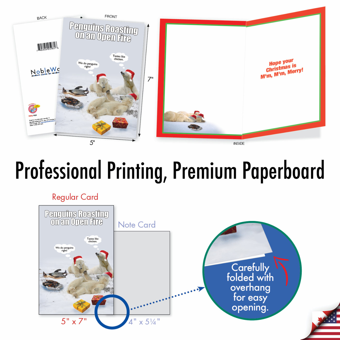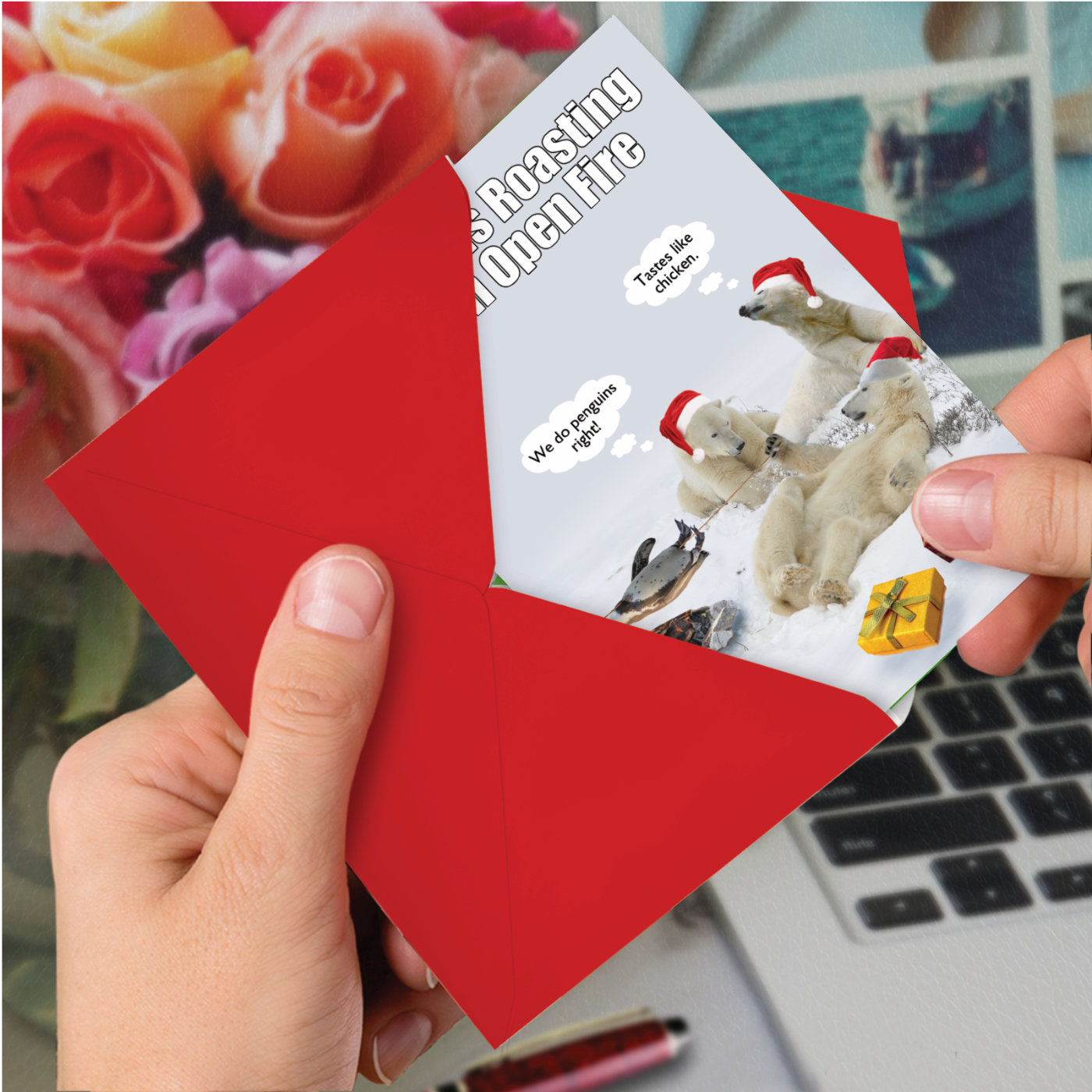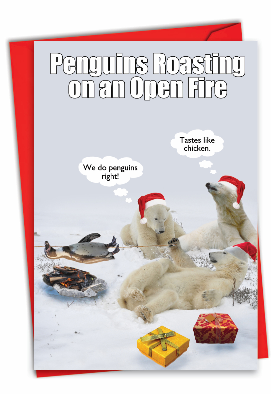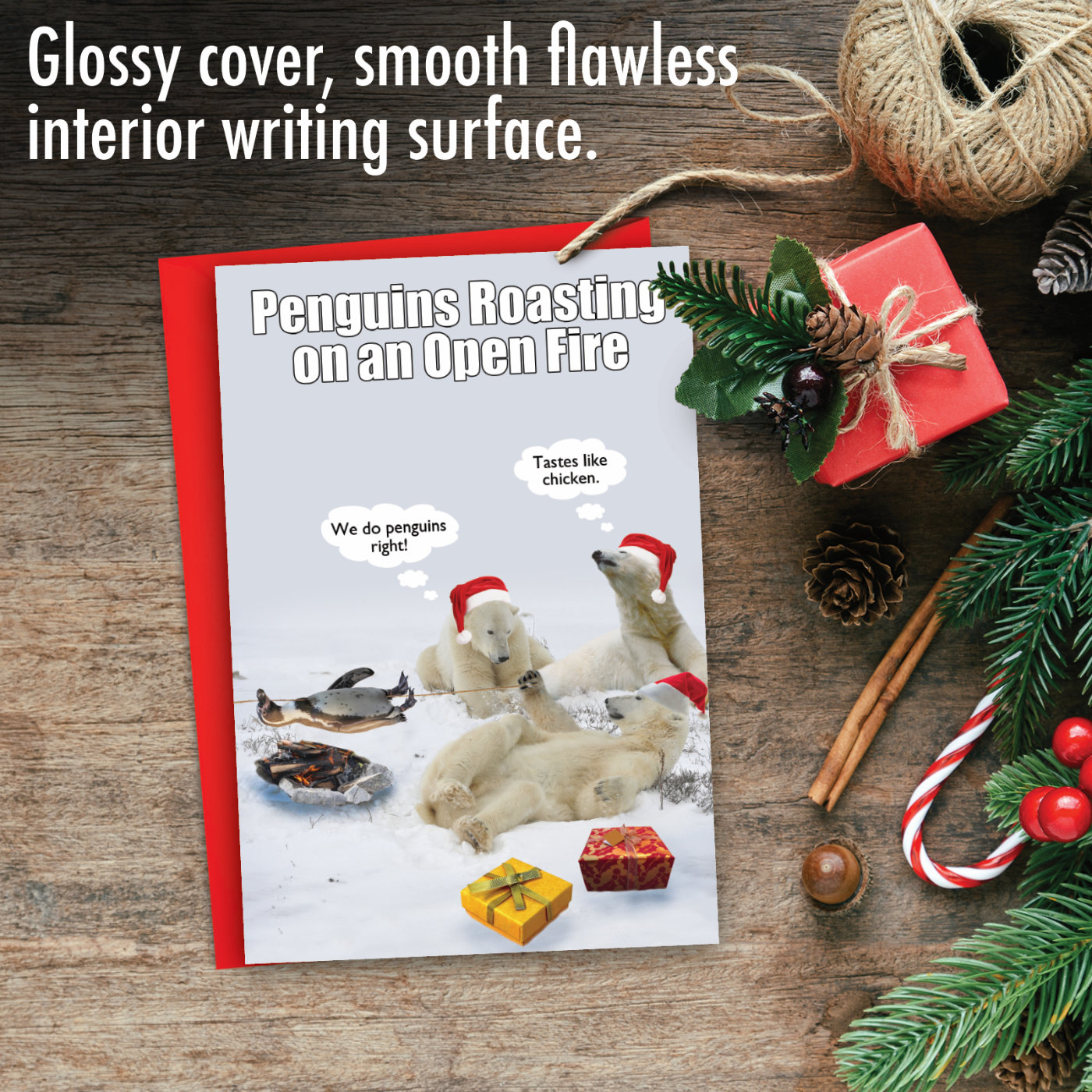 Penguin Roasting Open Fire - Hilarious Christmas Card, Wholesale