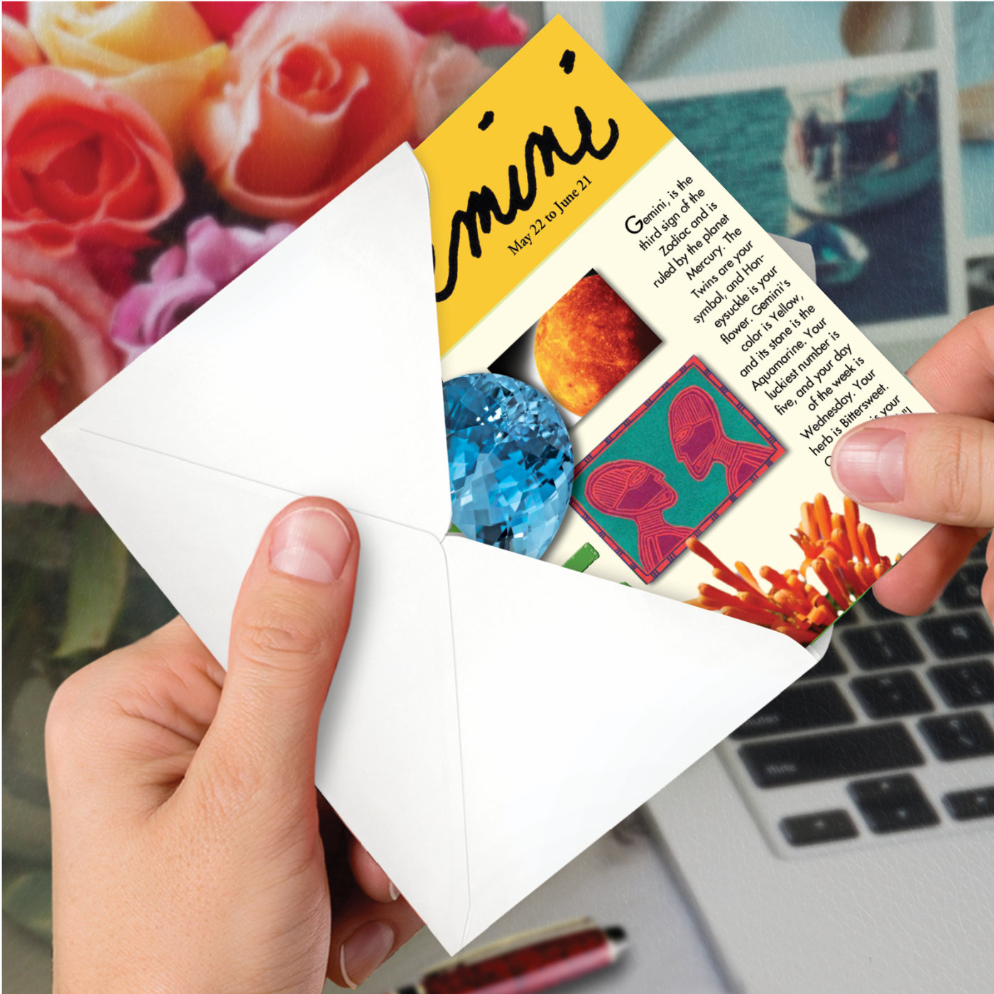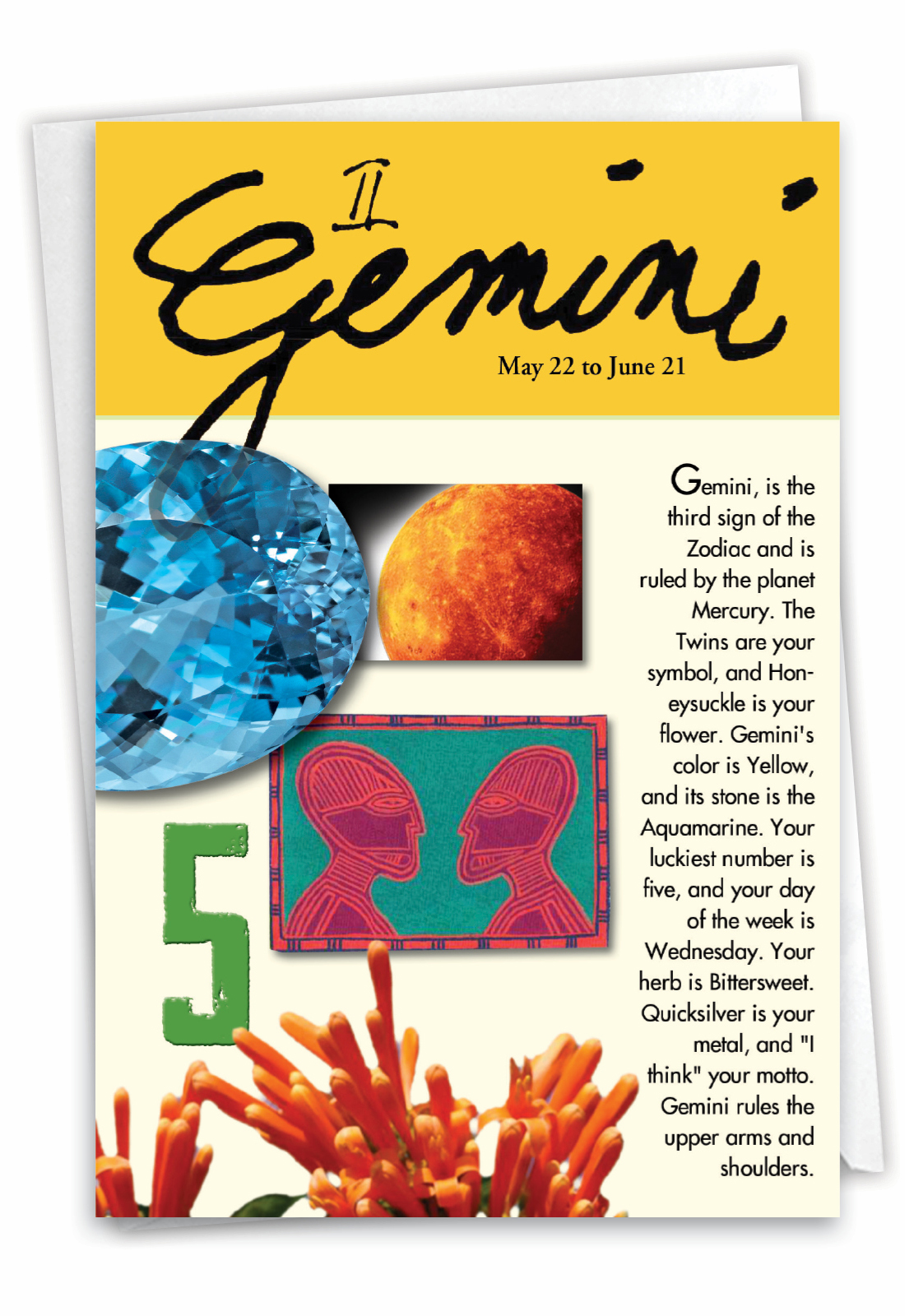 Gemini May 22 To June 21. Gemini Is The Third Sign Of The Zodiac And Is Ruled By The Planet Mercury. The Twins Are Your Symbol, And Honeysuckle Is Your Flower. Gemini's Color Is Yellow, And Its Stone Is The Aquamarine. Your Luckiest Number Is Five, And Your Day Of The Week Is Wednesday. Your Herb Is Bittersweet. Quicksilver Is Your Metal, And "I Think" Your Motto. Gemini Rules The Upper Arms And Shoulders.