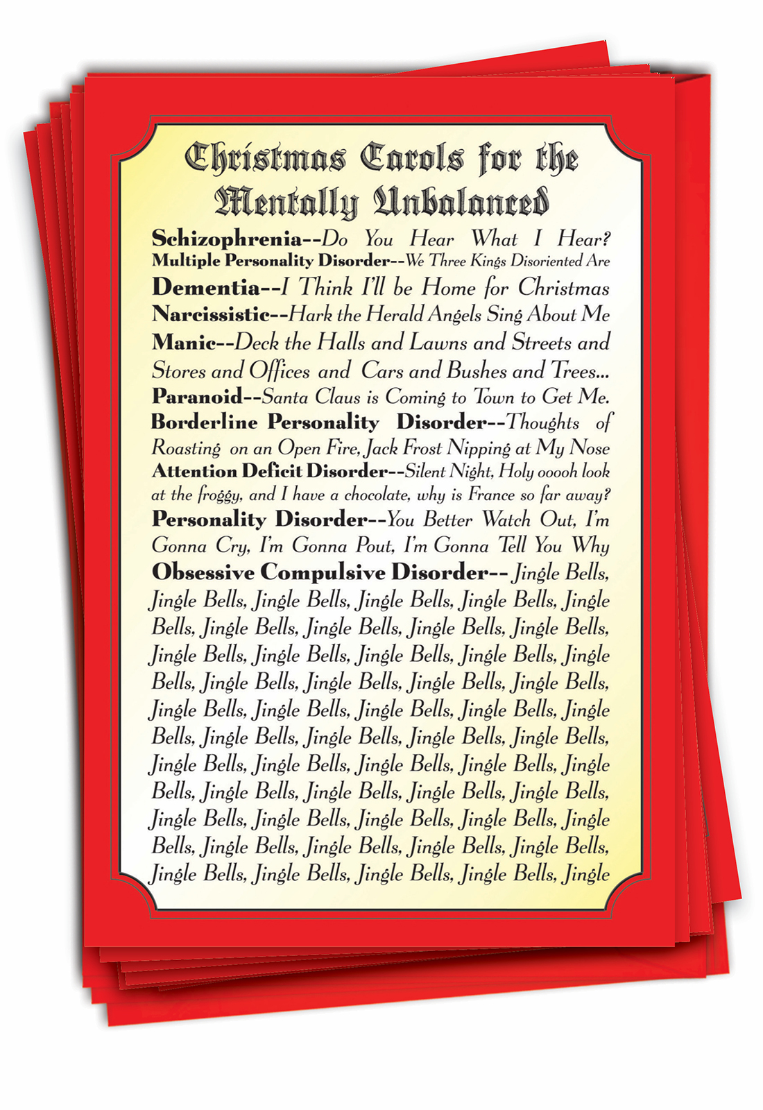 Christmas Carols For The Mentally Unbalanced. Schizophrenia -- Do You Hear What I Hear? Multiple Personality Disorder -- We Three Kings Disoriented Are Dementia -- I Think I'll Be Home For Christmas Narcissistic -- Hark The Herald Angels Sing About Me Manic -- Deck The Halls And Lawns And Streets And Stores And Offices And Cars And Bushes And Trees... Paranoid -- Santa Claus Is Coming To Town To Bet Me. Borderline Personality Disorder -- Thoughts Of Roasting On An Open Fire, Jack Frost Nipping At My Nose. Attention Deficit Disorder -- Silent Night, Holy Ooooh Look At The Froggy, And I Have A Chocolate, Why Is France So Far Away? Personality Disorder -- You Better Watch Out, I'm Going To Cry, I'm Going To Put, I'm Going To Tell You Why. Obsessive Compulsive Disorder -- Jingle Bells, Jingle Bells, Jingle Bells, Jingle Bells, Jingle Bells, Jingle Bells, Jingle Bells, Jingle Bells, Jingle Bells, Jingle Bells, Jingle Bells, Jingle Bells, Jingle Bells, Jingle Bells, Jingle Bells, Jingle Bells, Jingle Bells, Jingle Bells, Jingle Bells, Jingle Bells, Jingle Bells, Jingle Bells, Jingle Bells, Jingle Bells, Jingle Bells, Jingle Bells, Jingle Bells, Jingle Bells, Jingle Bells, Jingle Bells, Jingle Bells, Jingle Bells, Jingle Bells, Jingle Bells, Jingle Bells, Jingle Bells, Jingle Bells, Jingle Bells, Jingle Bells, Jingle Bells, Jingle Bells, Jingle Bells, Jingle Bells, Jingle Bells, Jingle Bells, Jingle Bells, Jingle Bells, Jingle Bells, Jingle Bells, Jingle Bells