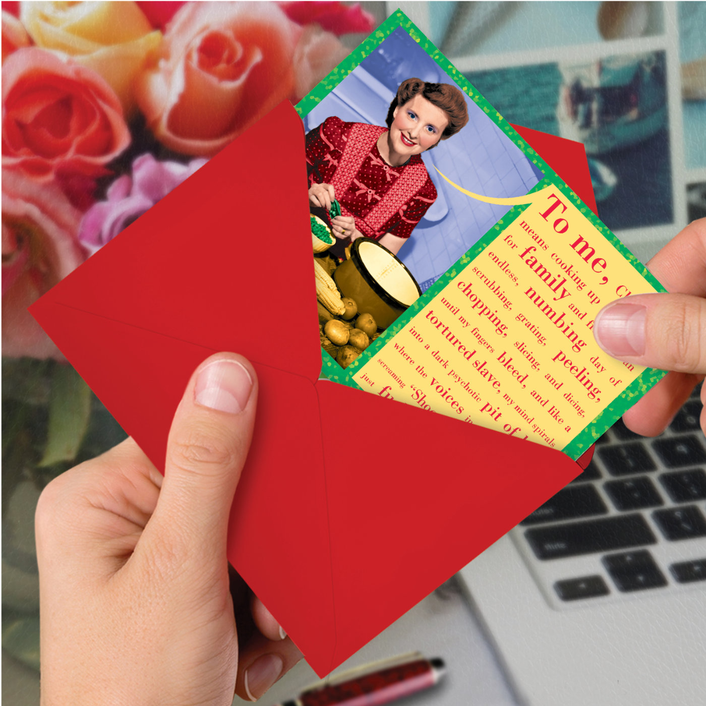 To me, Christmas means cooking up a feast for family and friends...an endless, numbing day of scrubbing, grating, peeling, chopping, slicing, and dicing, until my f'ingers bleed, and like a tortured slave, my mind spirals into a dark psychotic pit of hell where the voices in my head begin screaming "Shoot me, please, somebody just f'ing shoot me!"