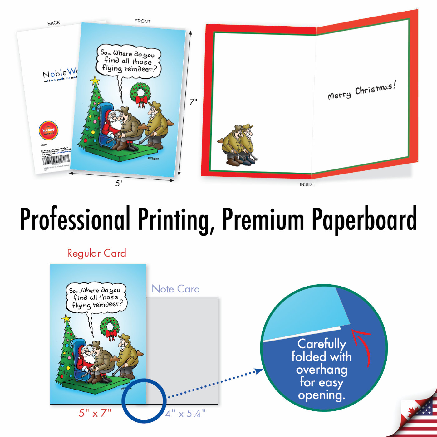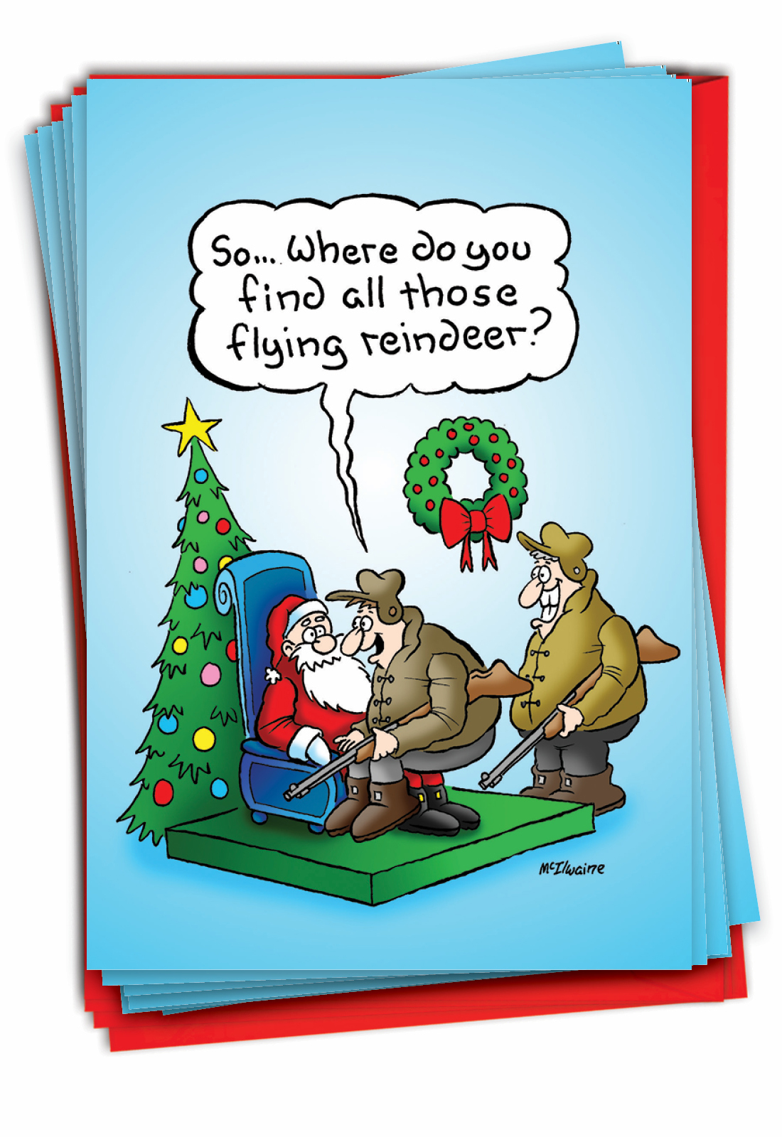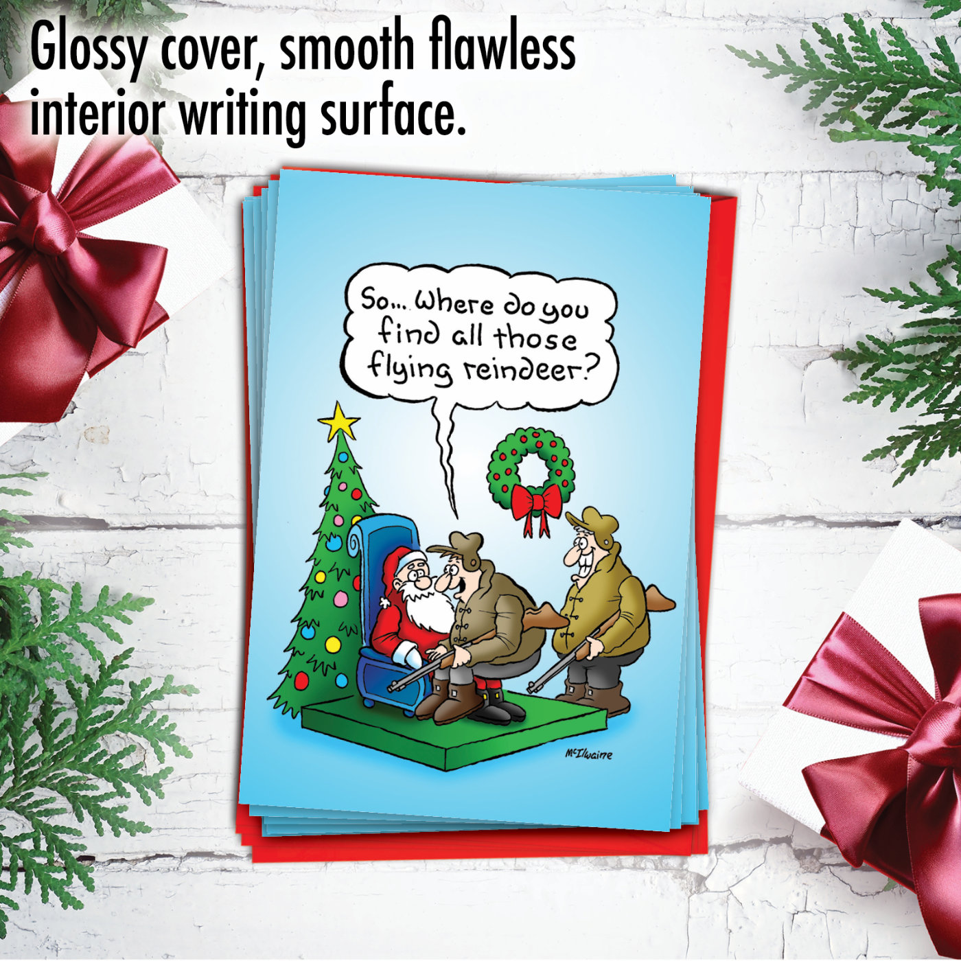 Hunter Flying Reindeer - Hilarious Christmas Box of 12 Cards, Wholesale
