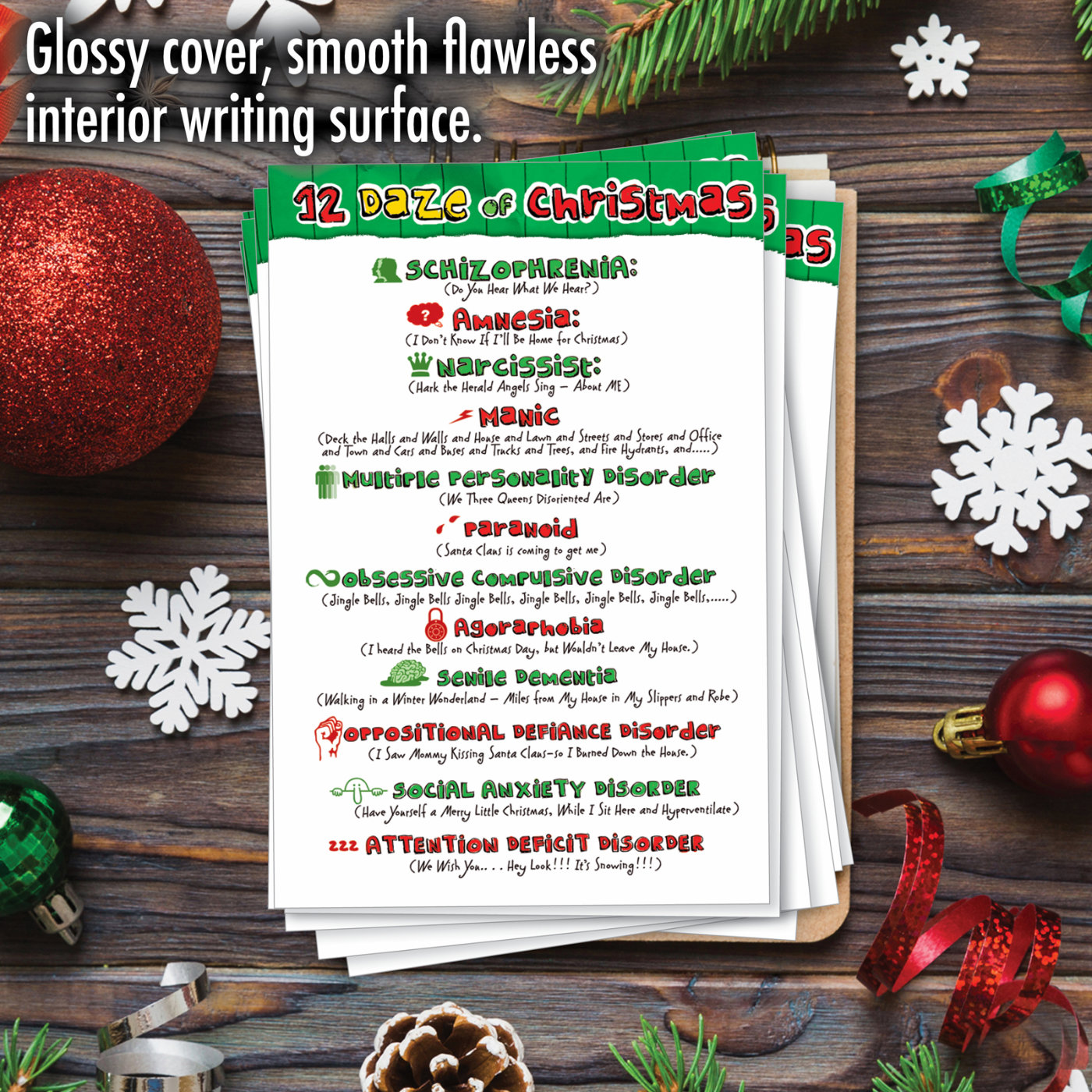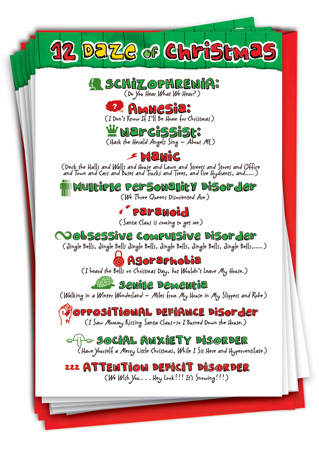 12 Daze Of Christmas. Schizophrenia: Do You Hear What We Her? Amnesia: I Donõt Know If Iõll Be Home For Christmas. Narcissist: Hark The Herald Angels Singñabout Me. Manic: Deck The Halls And Walls And House And Lawn And Streets And Stairs And Office And Town And Cars And Buses And Tracks And Fire Hydrants And... Multiple Personality Disorder: We Three Queens Disoriented Are. Paranoid: Santa Claus Is Coming To Get Me. Obsessive Compulsive Disorder: Jingle Bells, Jingle Bells, Jingle Bells, Jingle Bells, And Jingle Bells. Agoraphobia: I Heard The Bell On Christmas Day, But Wouldnõt Leave My House. Senile Dementia: Walking In A Winter Wonderlandñmiles From My House In My Slippers And Robe. Oppositional Defiance Disorder: I Saw Mommy Kissing Santa Clausñso I Burned Down The House. Social Anxiety Disorder: Have Yourself A Merry Little Christmas, While I Sit Home And Hyperventilate. Attention Deficit Disorder: We Wish You...hey Look!!! Itõs Snowing.