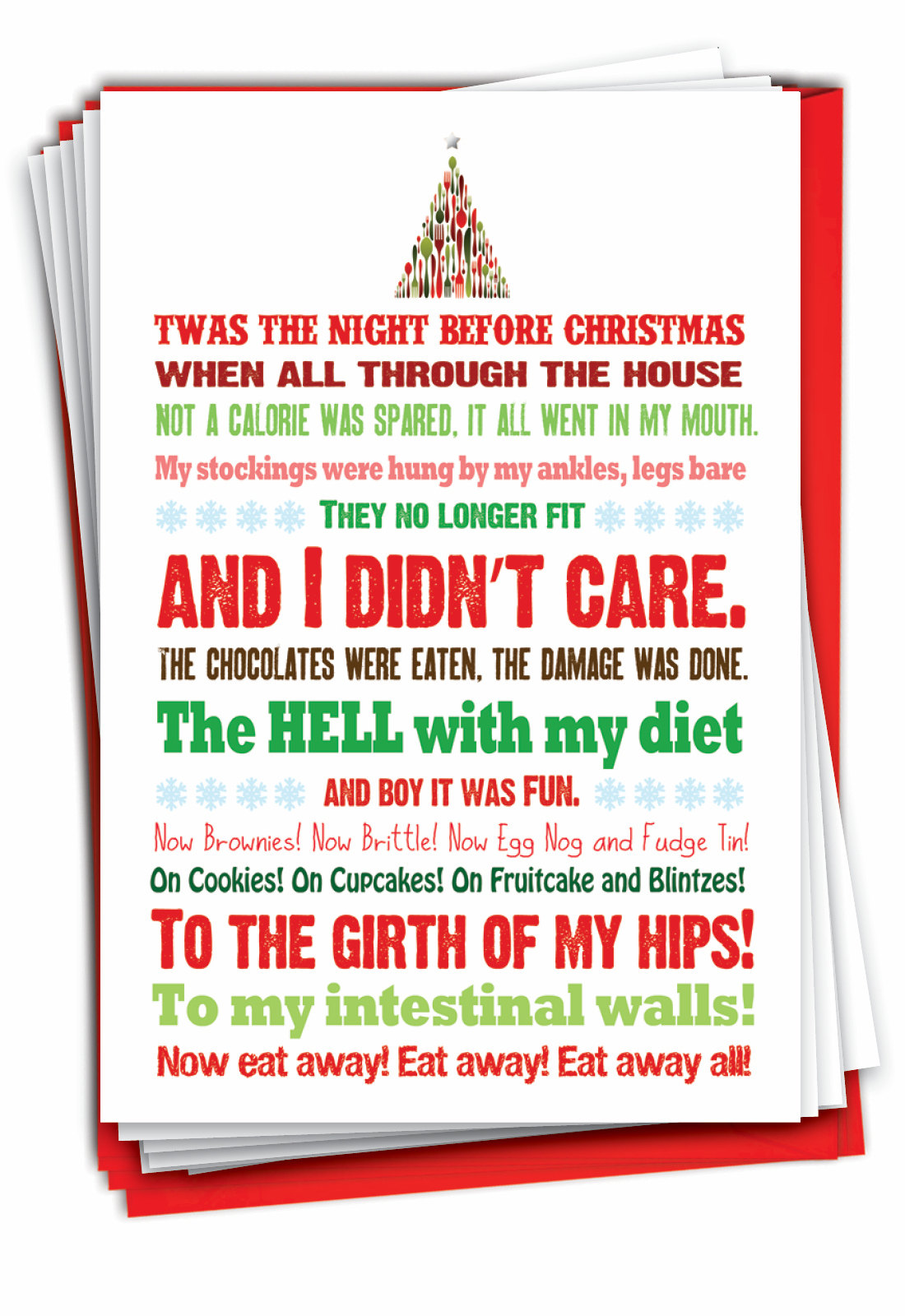 Tő Was The Night Before Christmas When All Through The House Not A Calorie Was Spared, It All Went In My Mouth. My Stockings Were Hung By My Ankles, Legs Bare. They No Longer Fit And I Didnőt Care. The Chocolates Were Eaten, The Damage Was Done. The Hell With My Diet, And Boy Was It Fun. Now Brownies! Now Brittle! Now Eggnog And Fudge! On Cookies! On Cupcakes! On Fruitcakes And Blintzes! To The Girth Of My Hips! To My Intestinal Walls! Now Eat Away! Eat Away! Eat Away!
