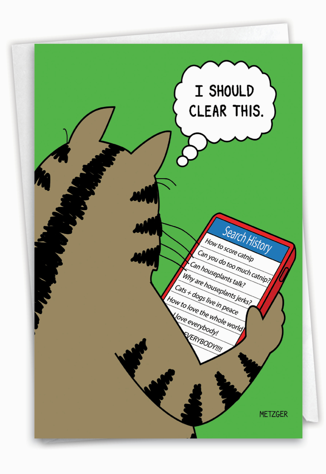 I Should Clear This. Search History: How To Score Catnip. Can You Do Too Much Catnip? Can Houseplants Talk? Why Are Houseplants Jerks? Cats + Dogs Live In Peace. How To Love The Whole World. I Love Everybody! Everybody!!!!
