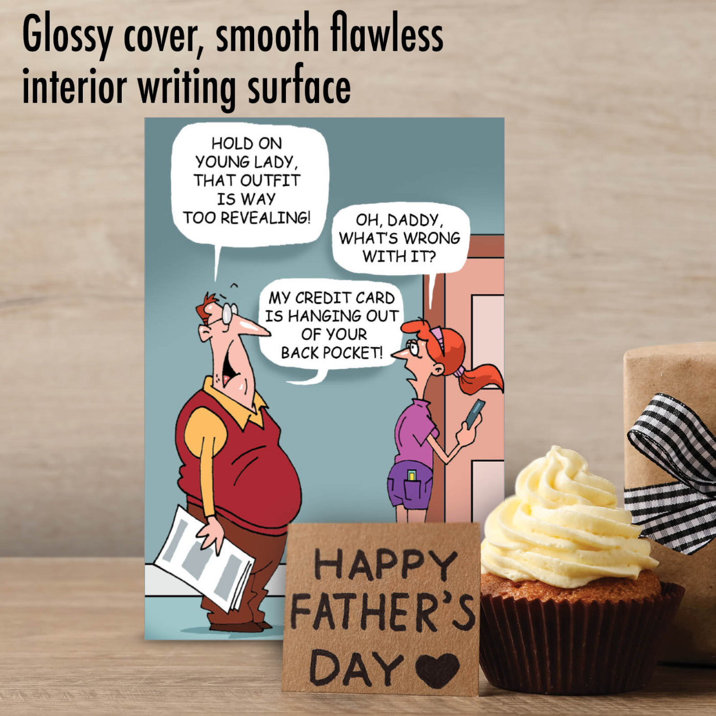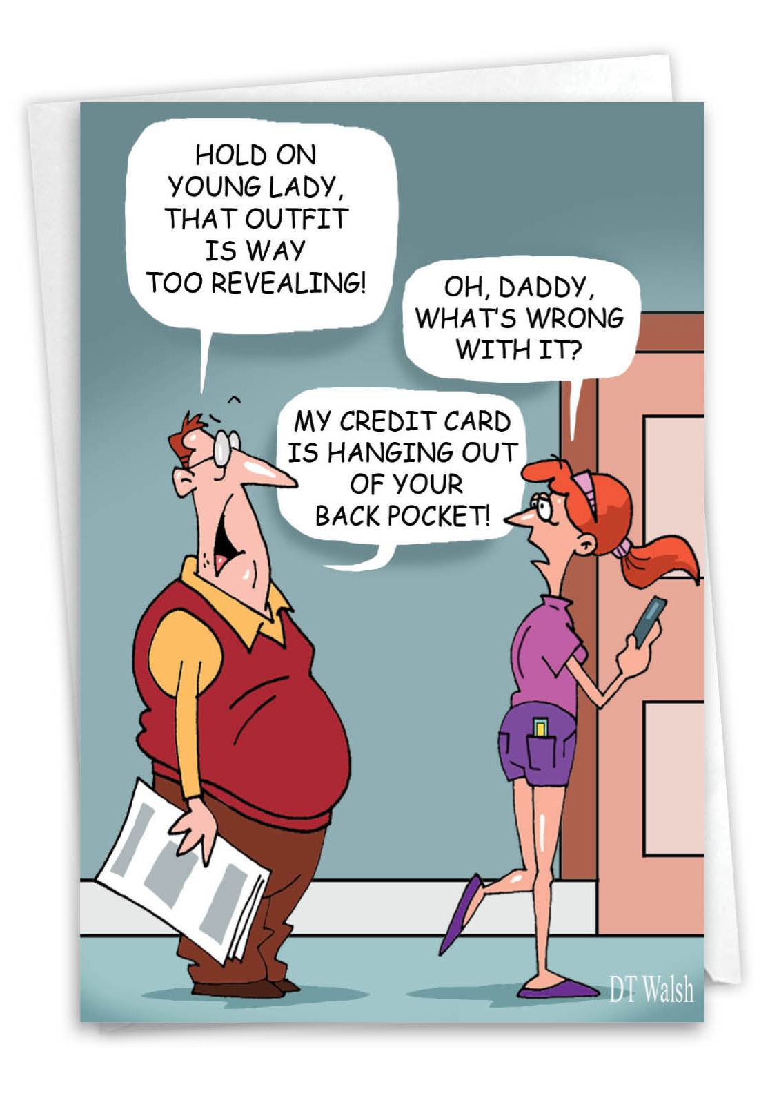 "Hold on young lady, that outfit is too revealing!" "Oh, Daddy, what's wrong with it?" "My credit card is hanging out of your back pocket!"