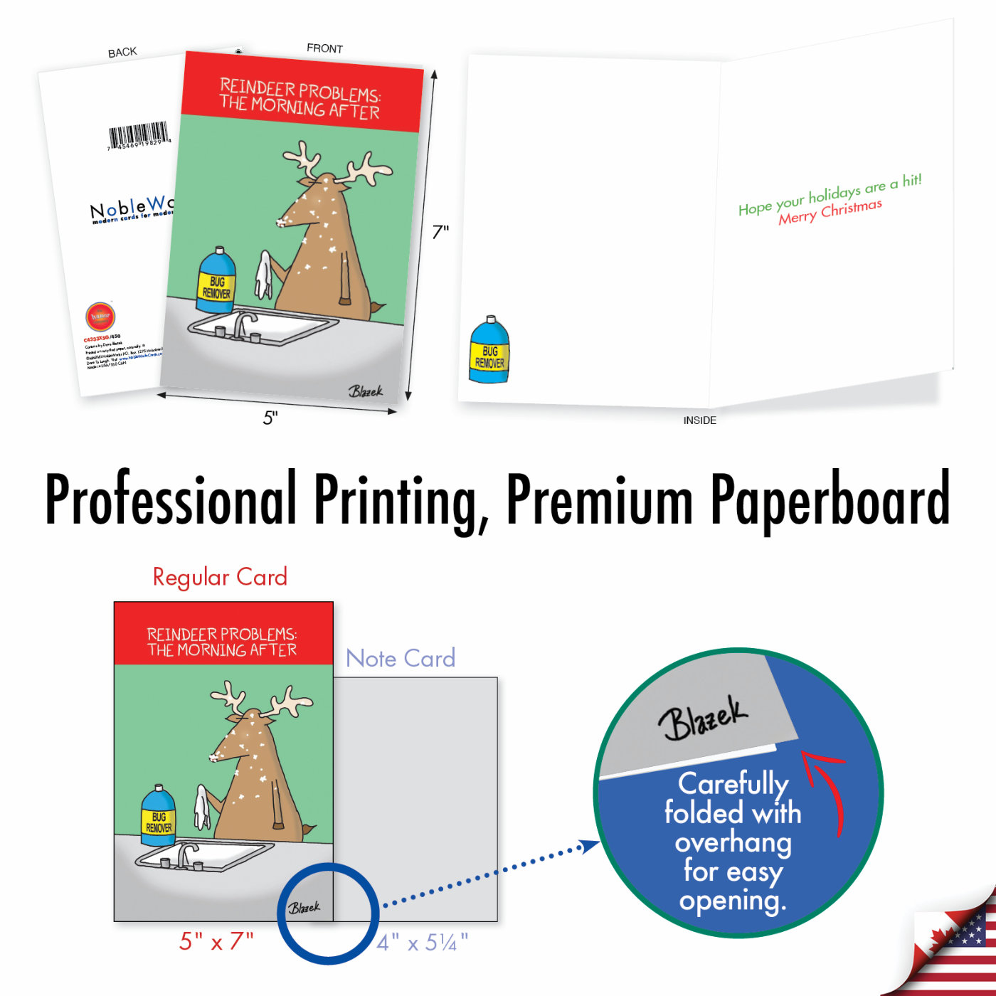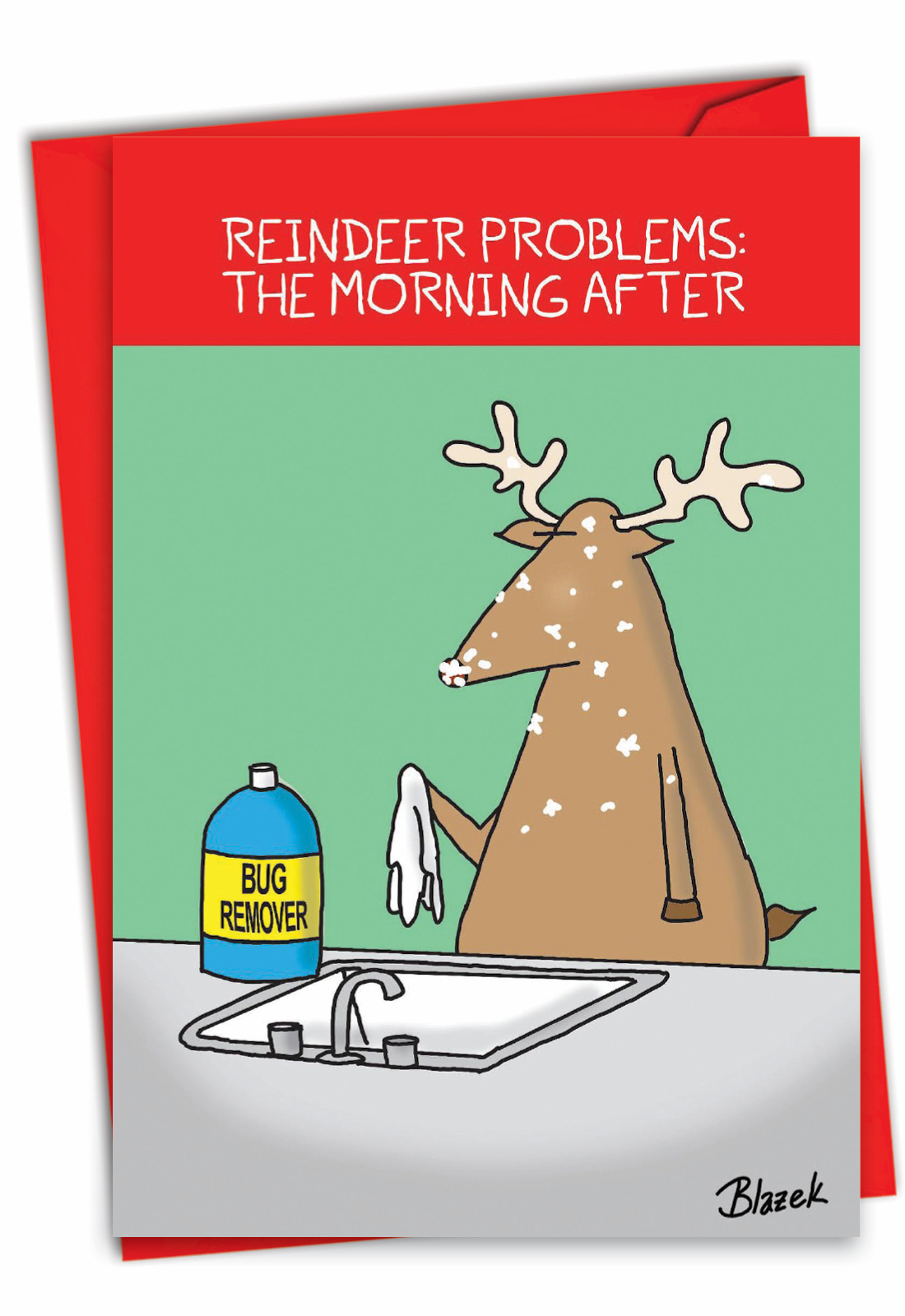 Hangovers. The morning after pill. We all do things we may regret the morning after. But the hilarious Reindeer Problems the Morning After Christmas Card from NobleWorks Inc. reminds us that regret is not unique to the human species. It turns out even the reindeer so often caroled about in cheery Christmas jingles have a morning-after problem too. Only this one is more closely related to insects and car windshields than fun stuff like booze and sex.