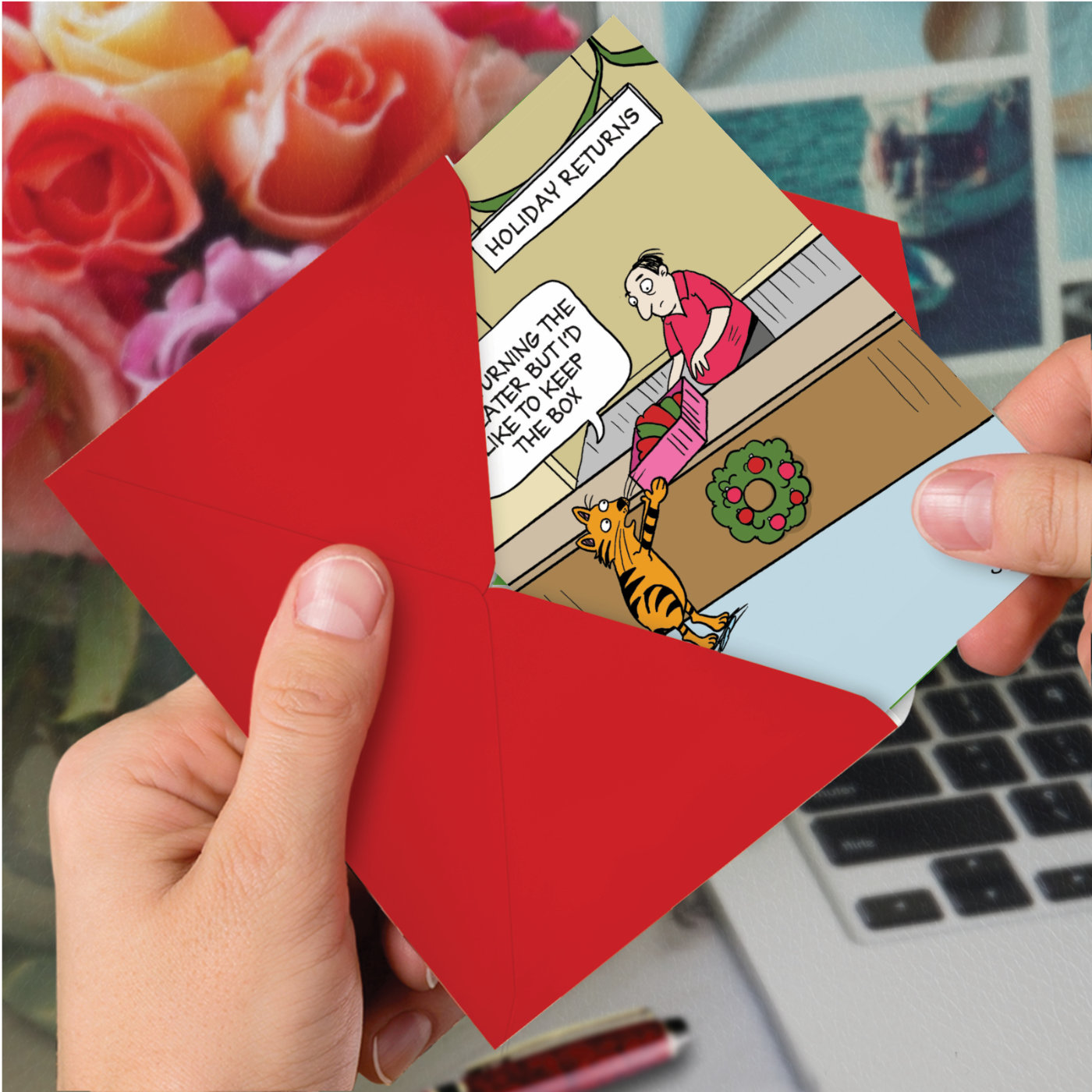 Drawing - literally - from her childhood inspiration by Garfield, syndicated cartoonist Maria Scrivan has used her outside-the-box style of humor to publish her work in MAD, National Lampoon and countless newspapers and websites. Her Humorous Cat Will Keep the Box Christmas Card goes inside the box, however, plumbing the depths of felines' famous and inexplicable affinity for these simple square pieces of cardboard. Any cat fancier will fancy this card. Given the legions of cat lovers in the land, that translates to fancy sales at your store.