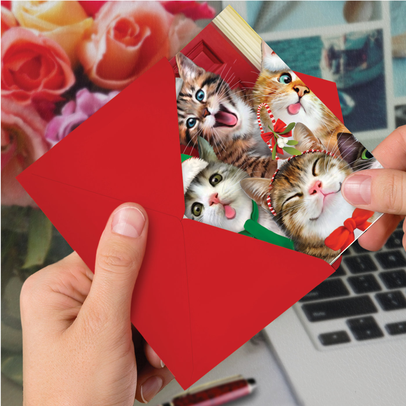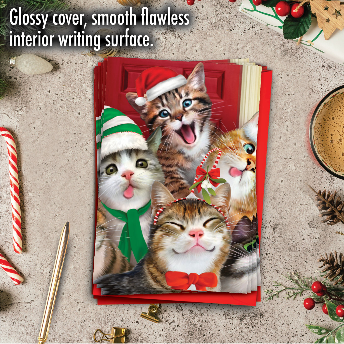 [image of illustrated cats wearing Santa hats]