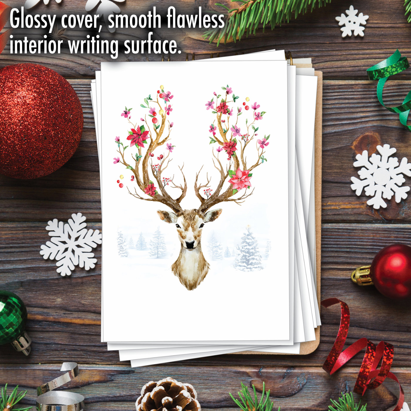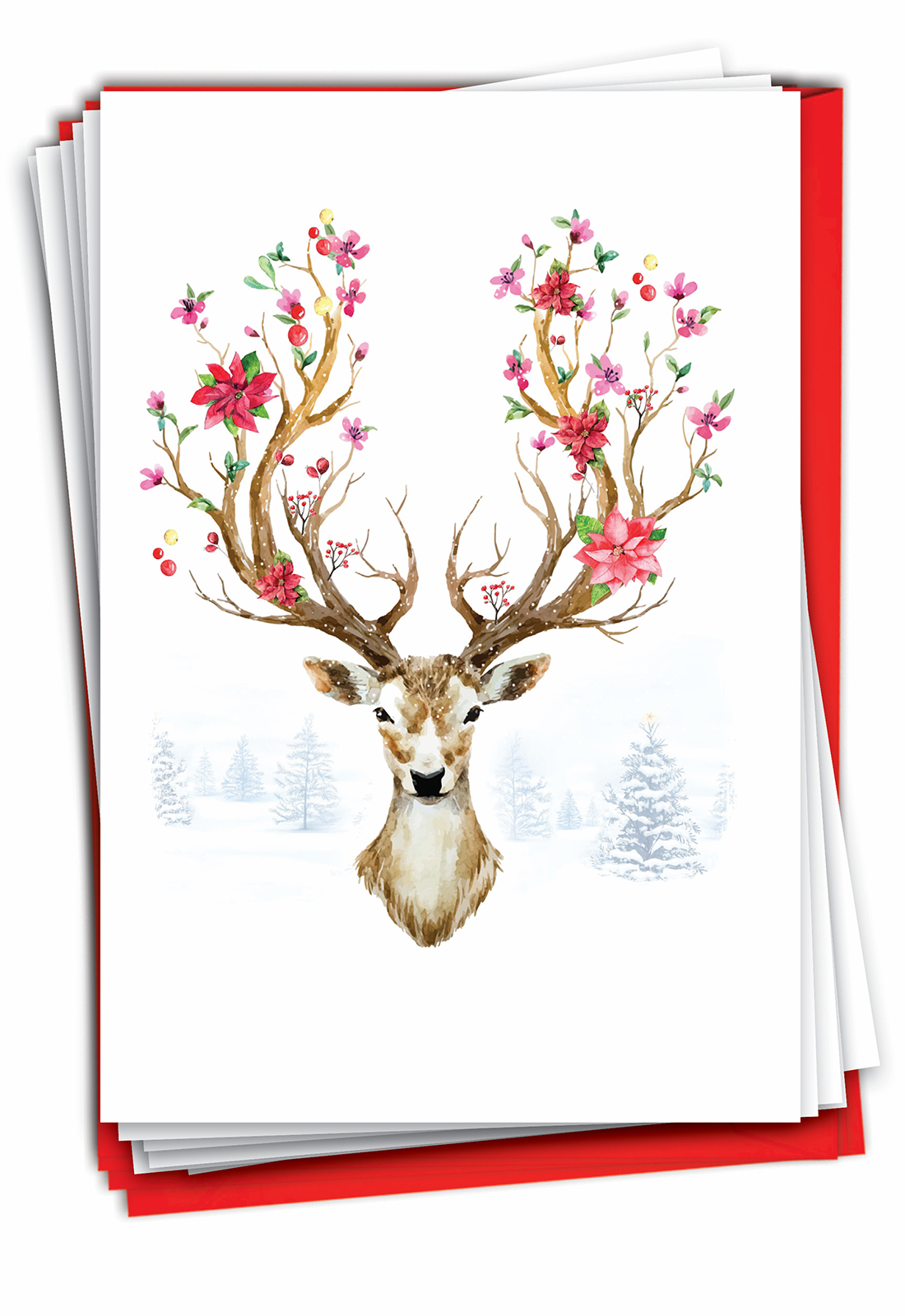 Blooming Reindeer - Poinsettia - Stylish Merry Christmas Box of 12 Cards, Wholesale