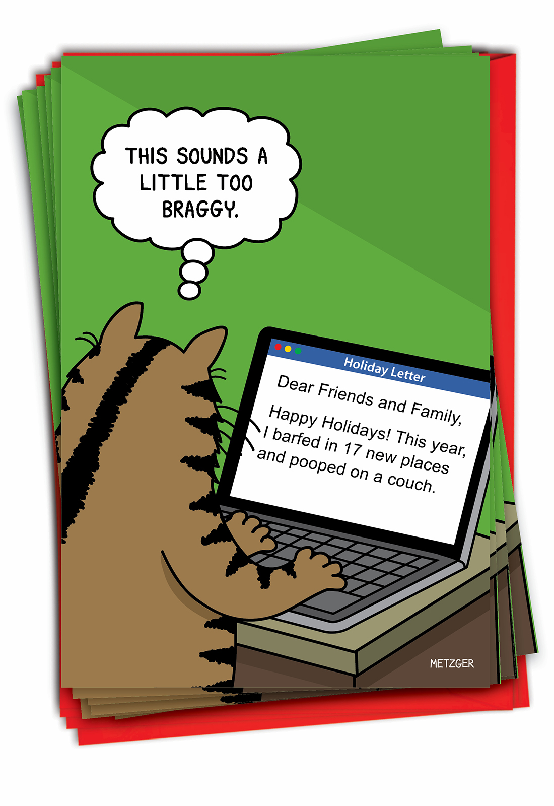 This sounds a little too braggy. Holiday Letter - Dear Friends and family, Happy Holidays! This year, I barfed in 17 new places and pooped on a couch.