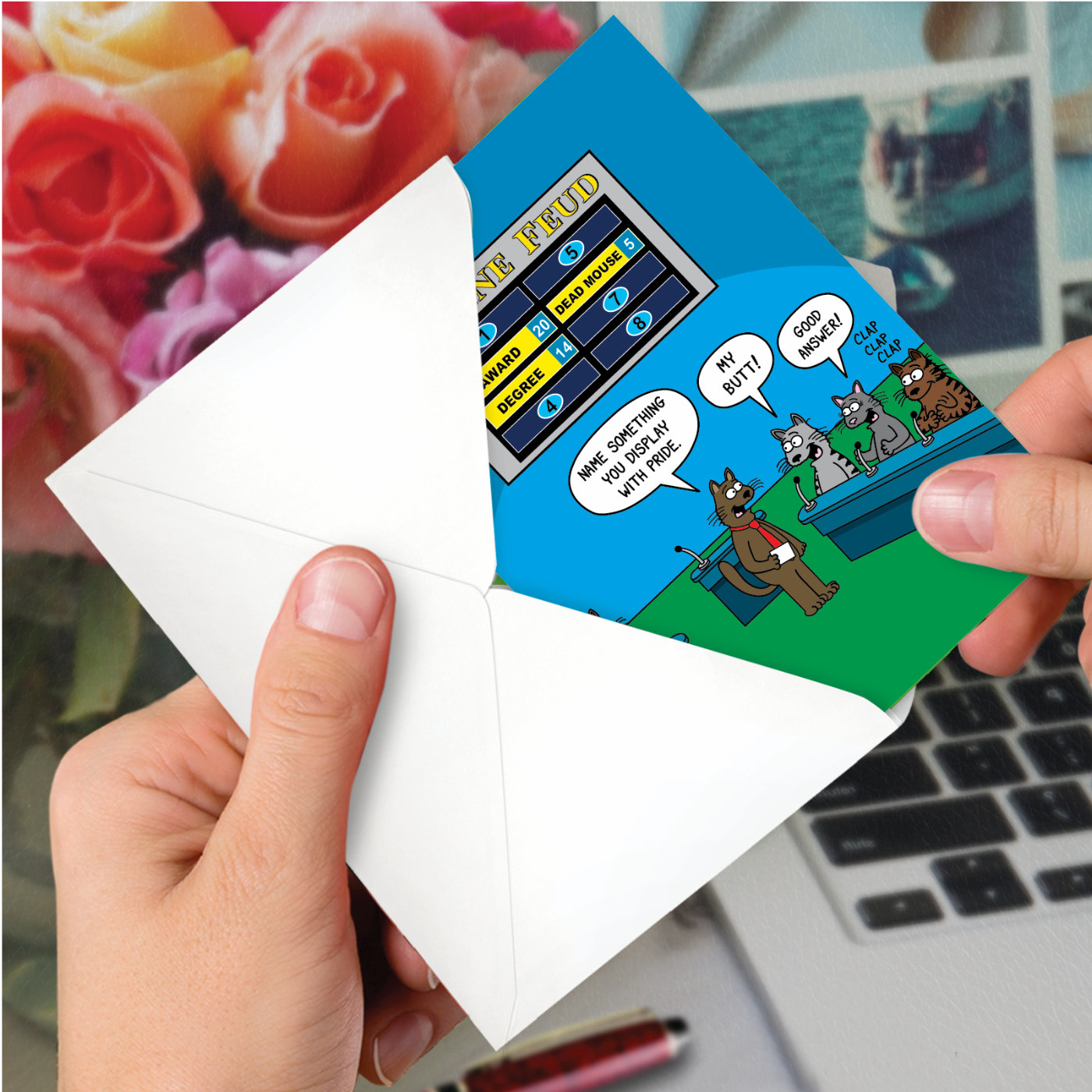 Feline Feud - Award-Degree-Dead Mouse - Name something you display with pride. My butt! Good answer! clap clap clap